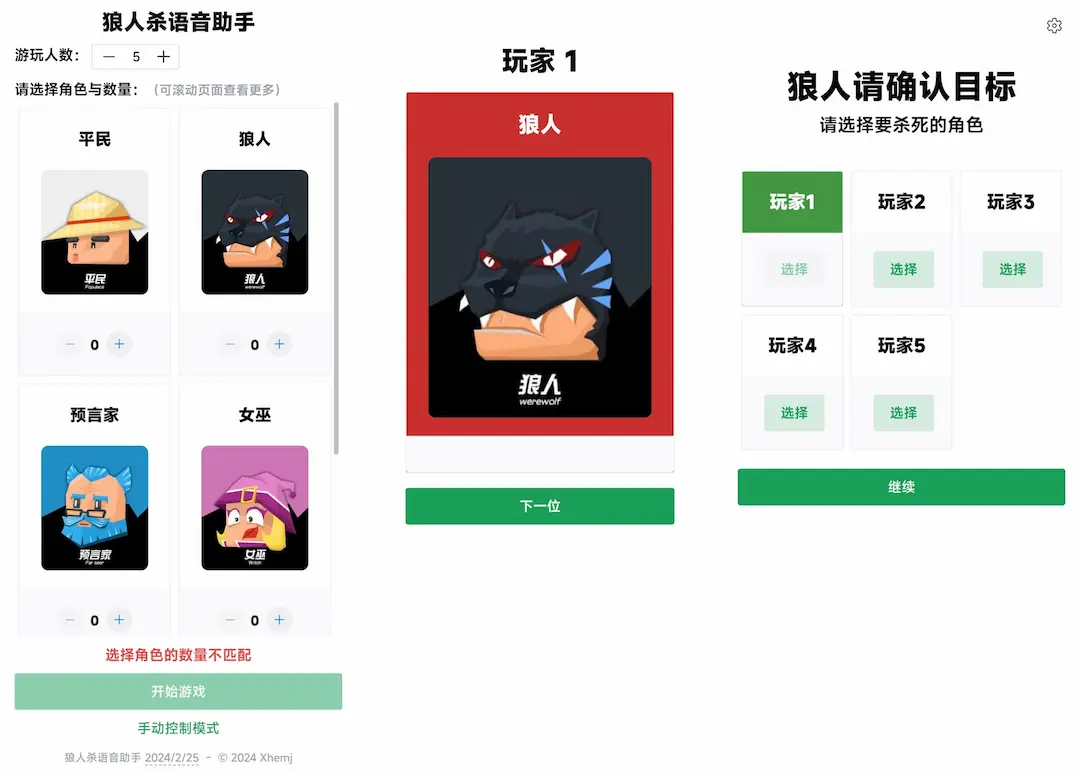 声明本网页设计素材源自《狼人杀语音法官助手》手机应用,仅作个人练习使用,非商业用途。如有版权问题,请联系删除。原始链接:https://github.com/sadaharusong/WolfKillAssistant一个包括了发牌、自动法官语音、自动评判结果的语音助手。